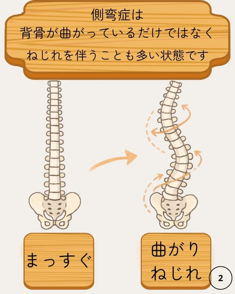 実は、側弯症などは背骨が左右に曲がっているだけでなく、