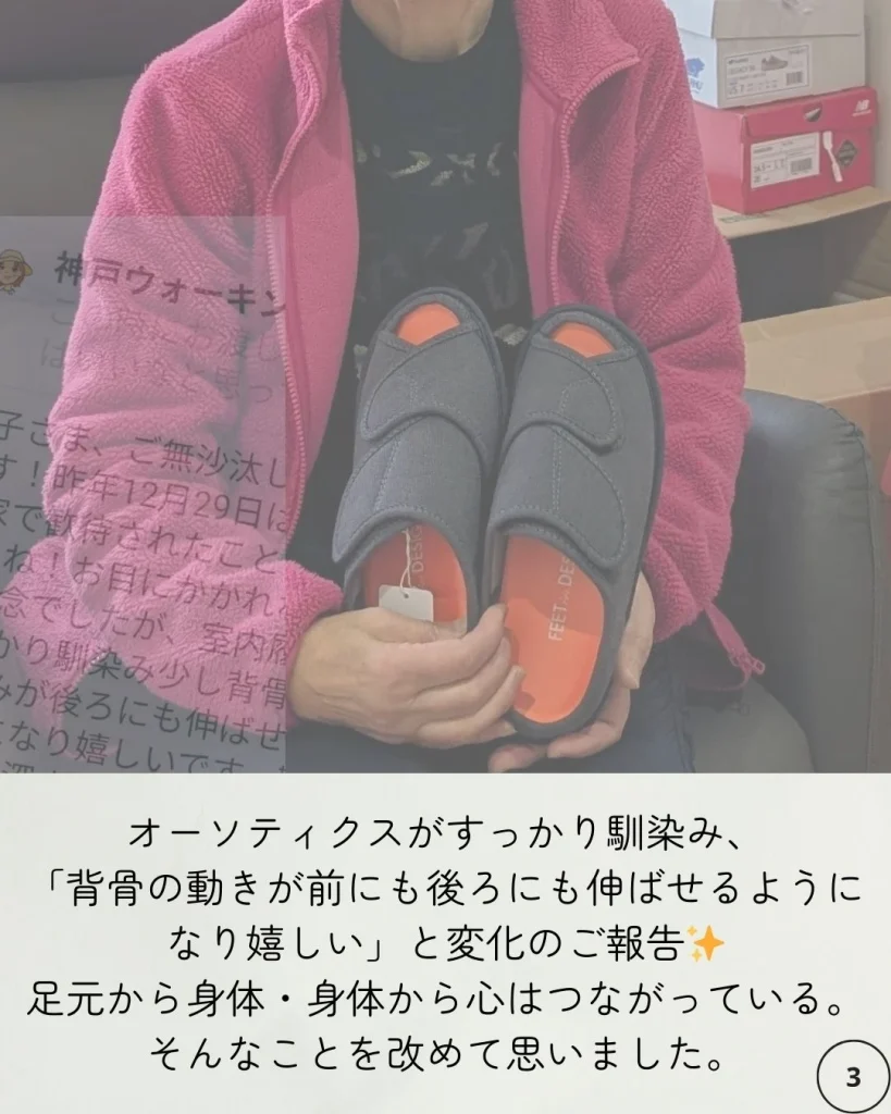 オーソティクス(補正インソール)を使い始めてから、「背骨の動きが、前にも後ろにも伸ばせるようになった!」とのこと。