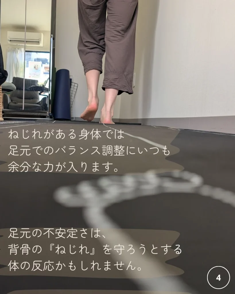 身体にねじれがあると足元でのバランス調整に、いつも余計な力が入り、身体が倒れないよう無意識に筋肉を固めて守る動きをします。